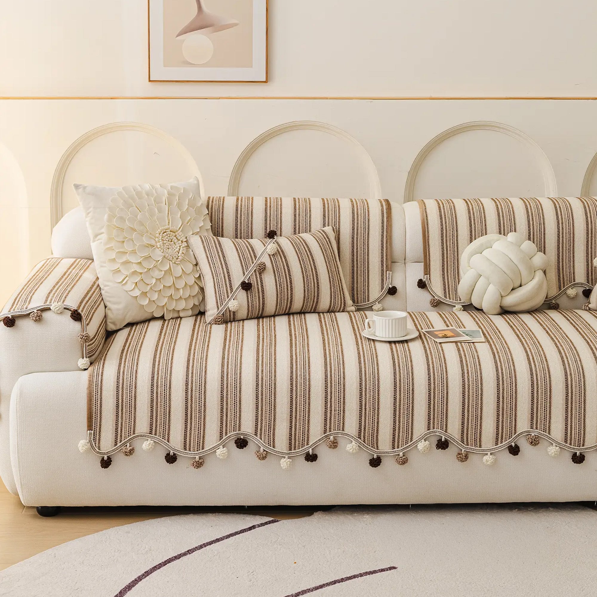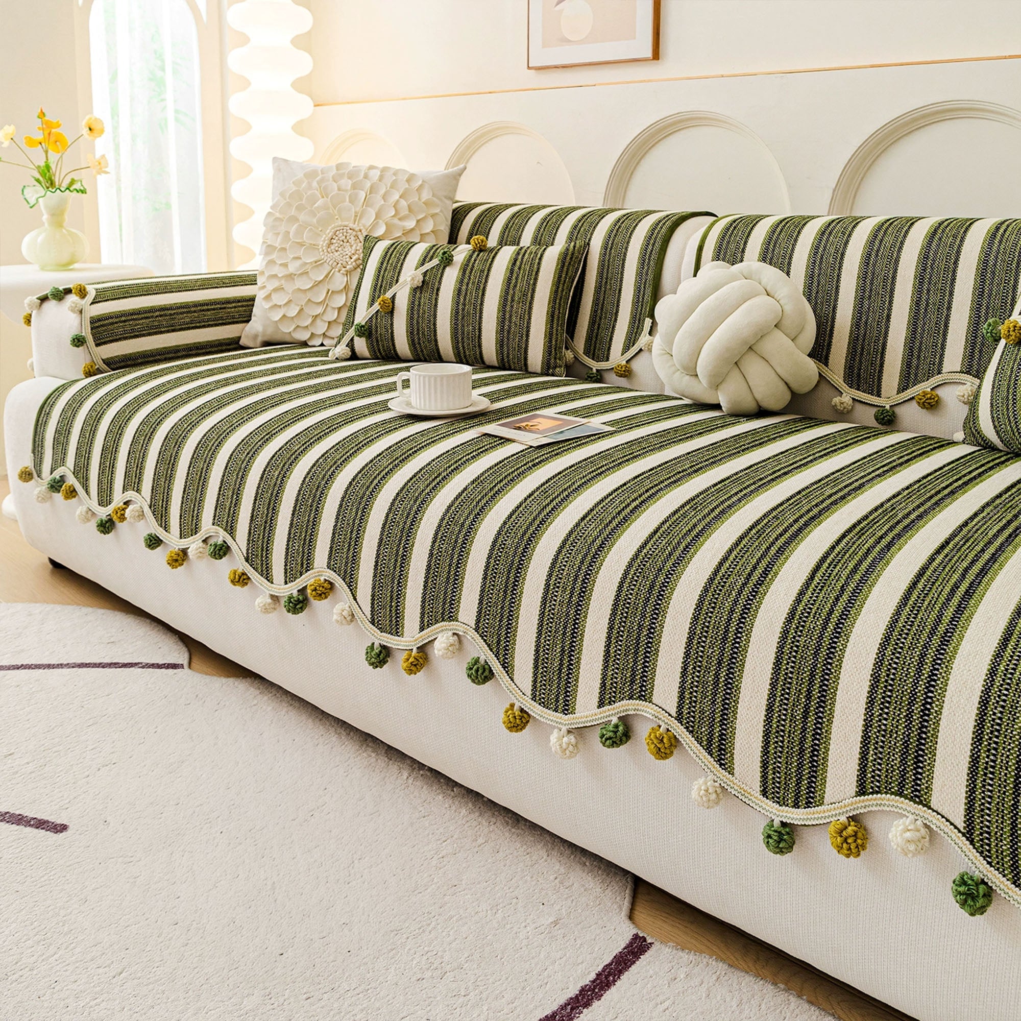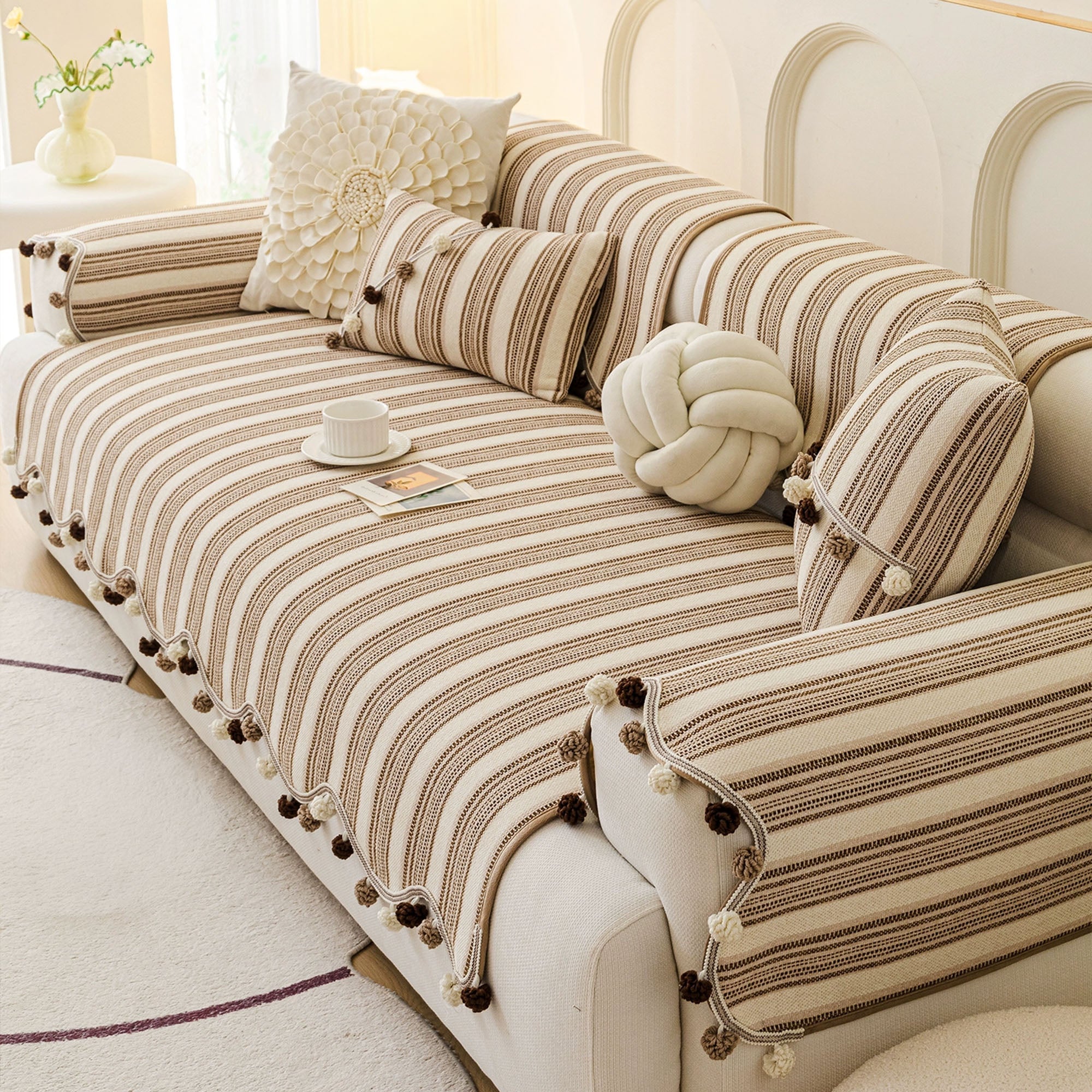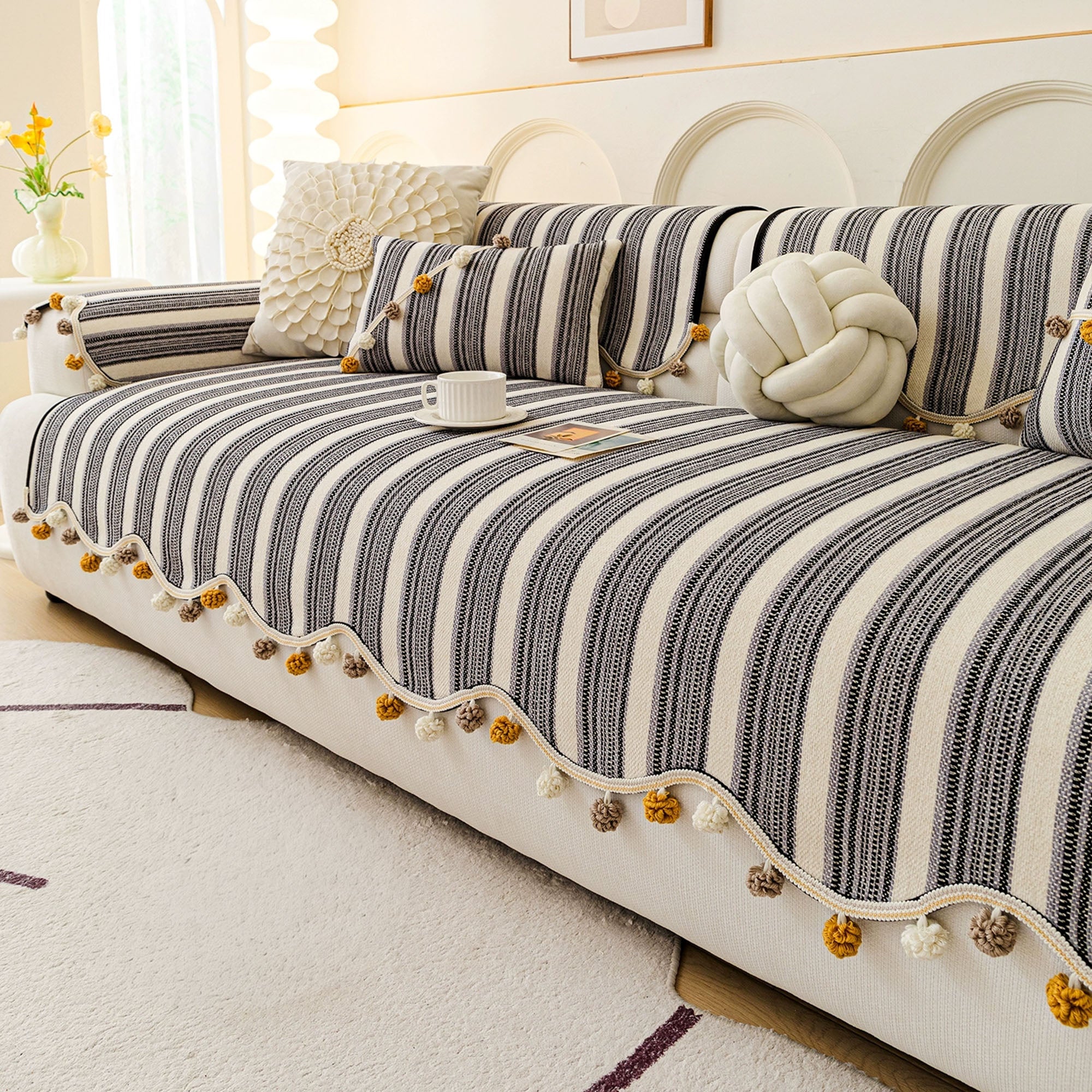Leve elegância e conforto lúdicos para o seu ambiente com a nossa Capa de Sofá Antiderrapante Chic Stripe Pom-Pom. Projetada com padrões listrados clássicos e uma borda de pompom extravagante, esta capa adiciona charme e estilo a qualquer ambiente.