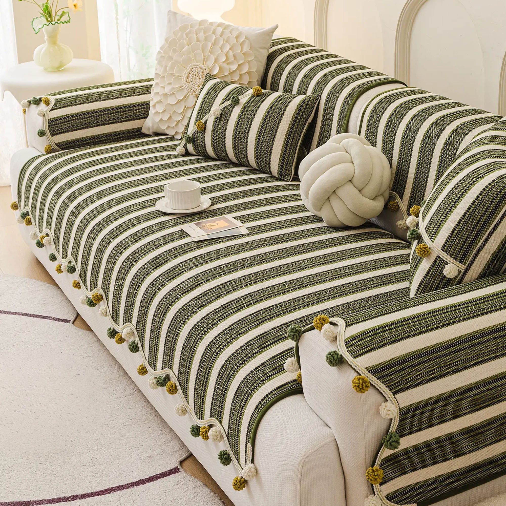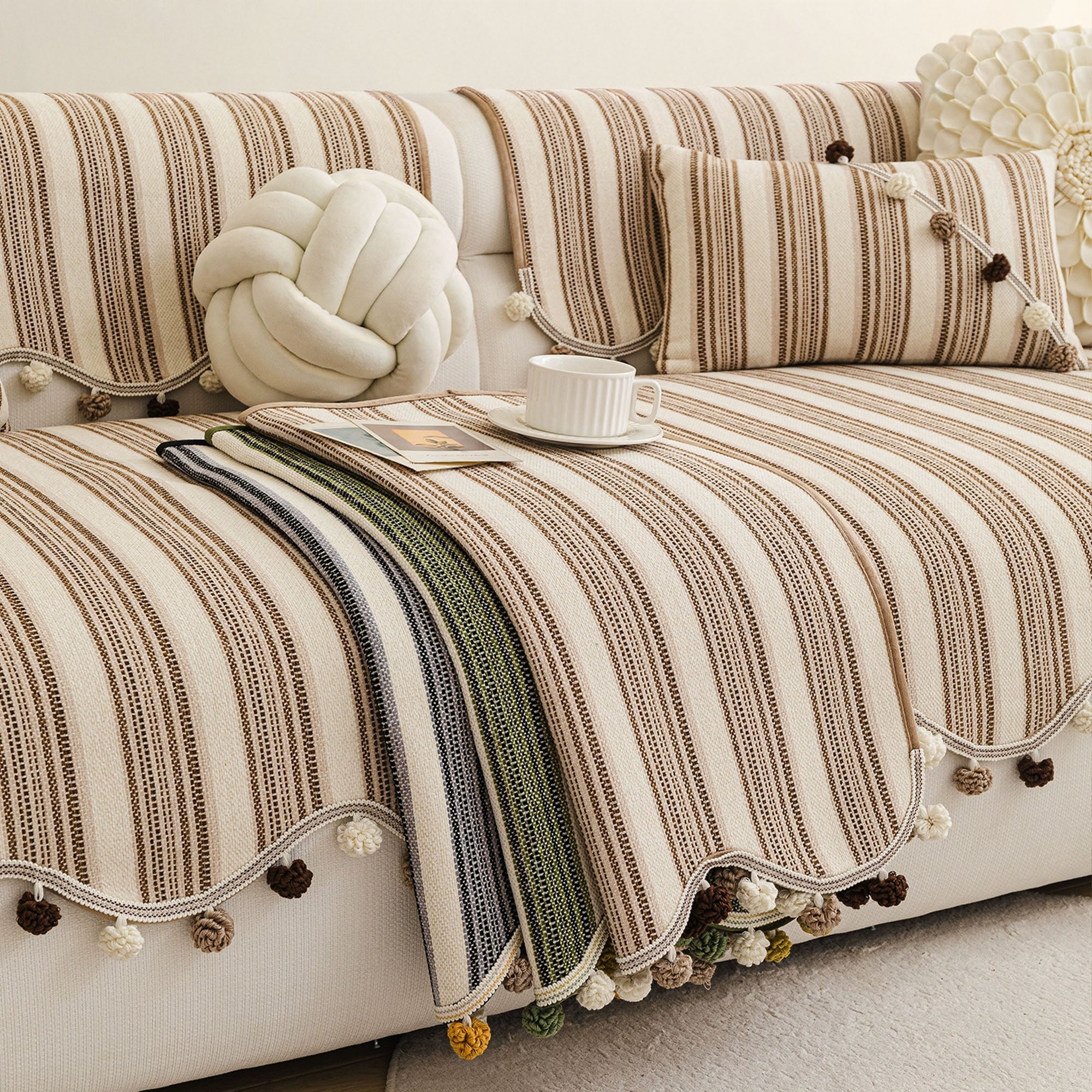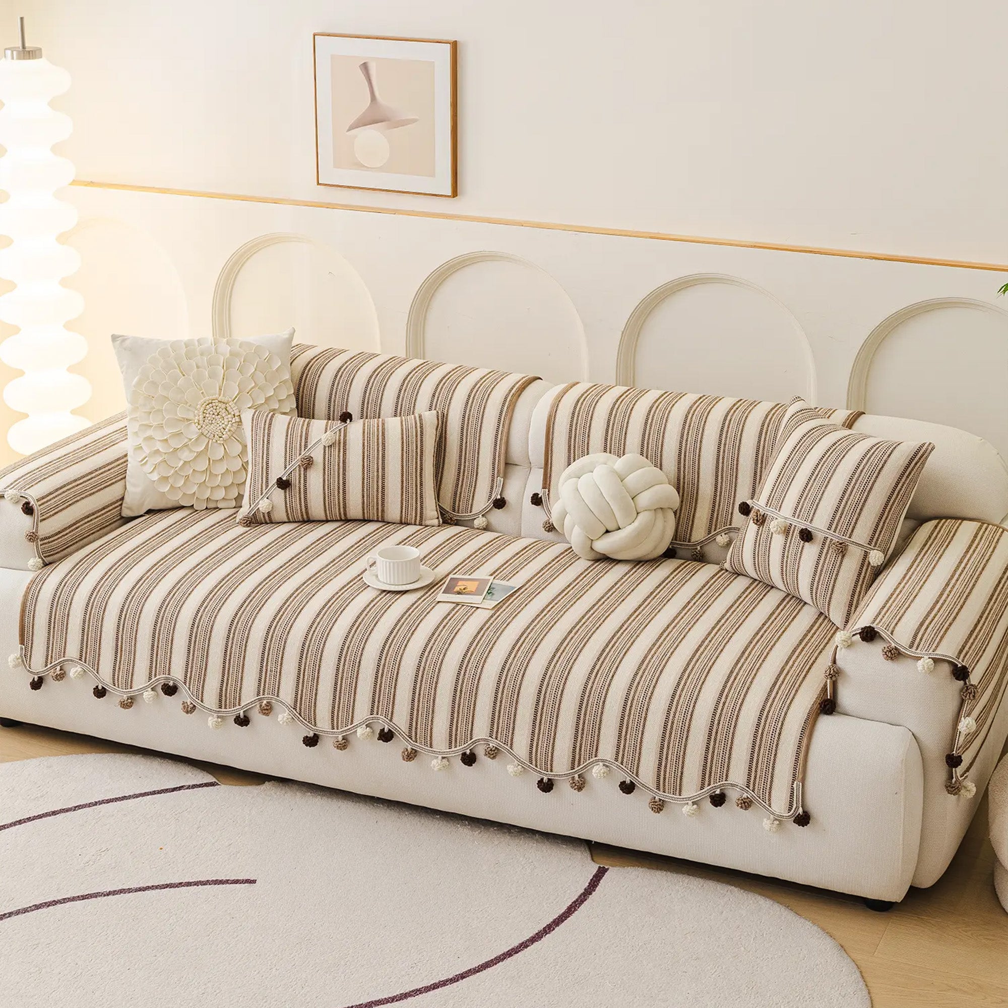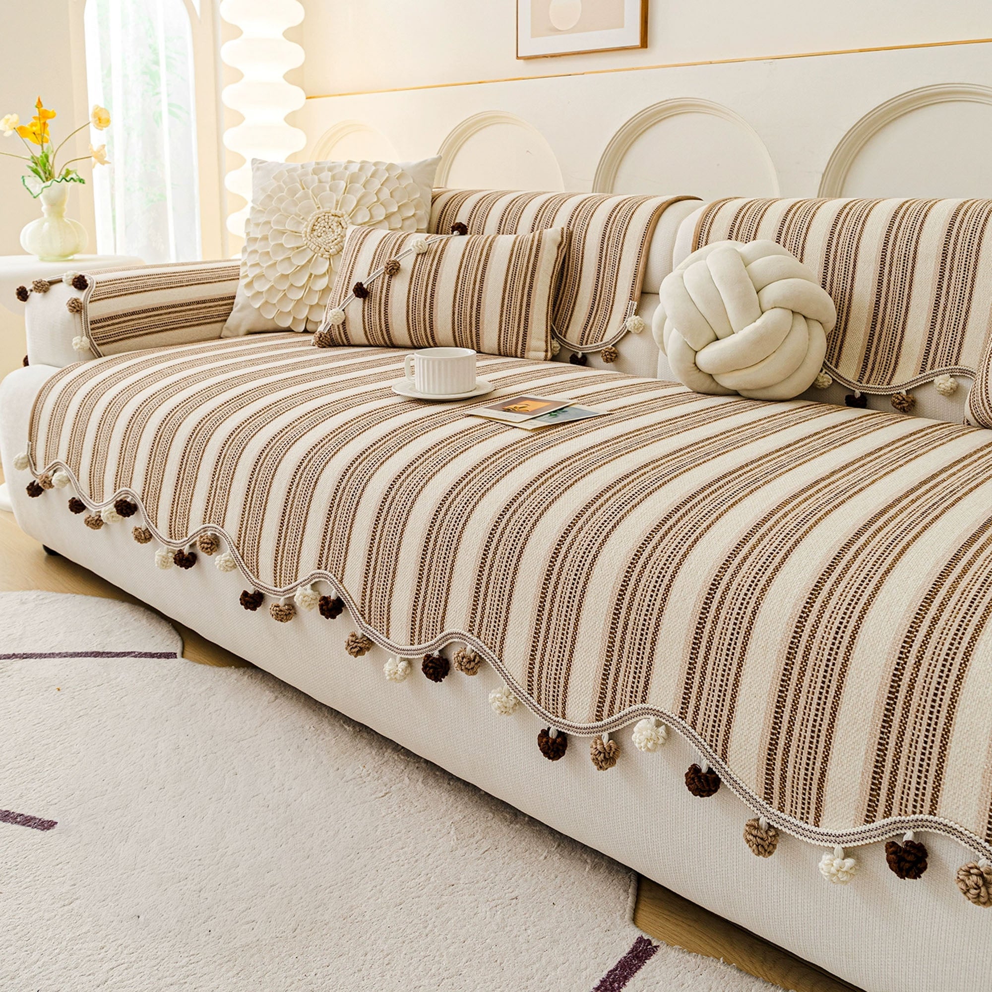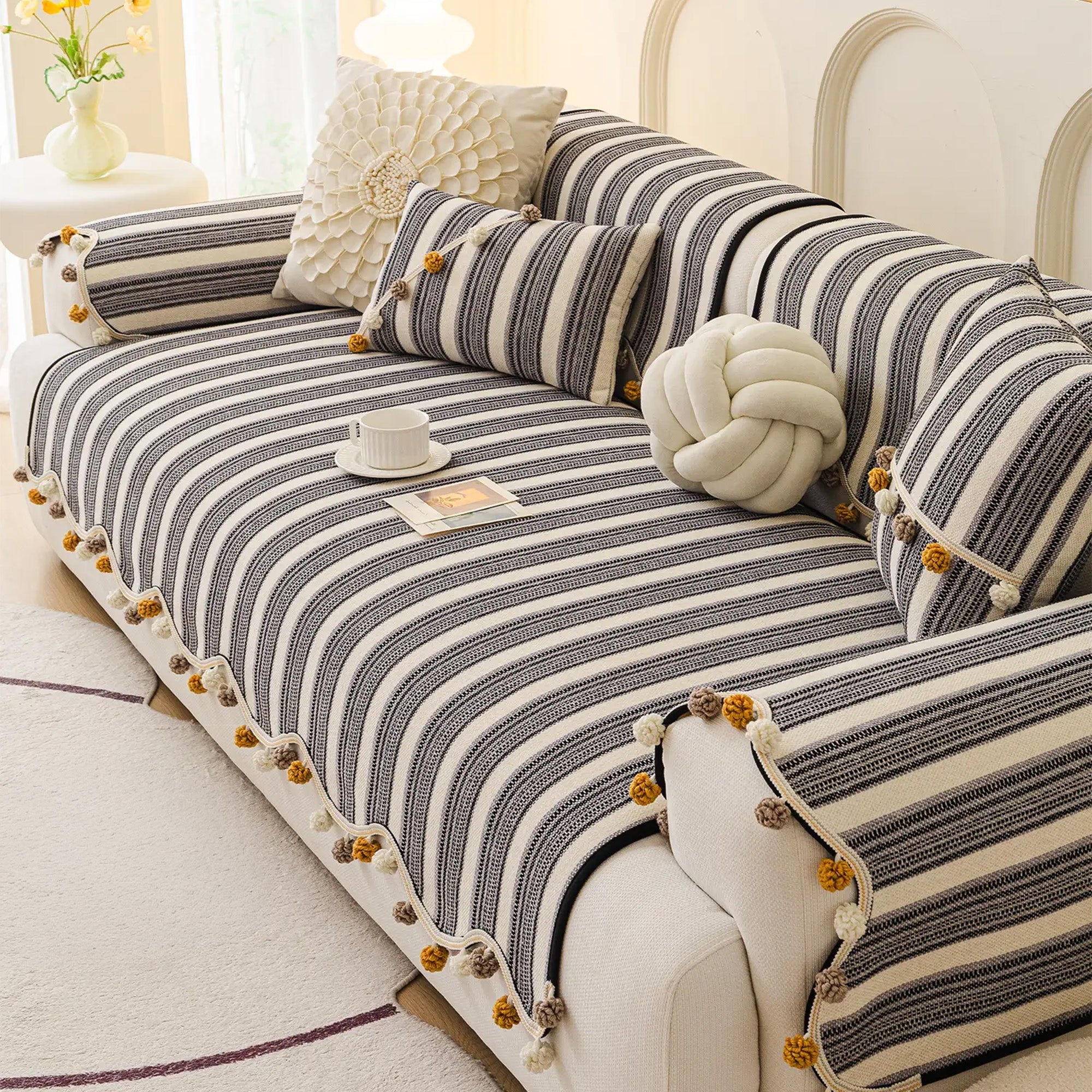 Leve elegância e conforto lúdicos para o seu ambiente com a nossa Capa de Sofá Antiderrapante Chic Stripe Pom-Pom. Projetada com padrões listrados clássicos e uma borda de pompom extravagante, esta capa adiciona charme e estilo a qualquer ambiente.