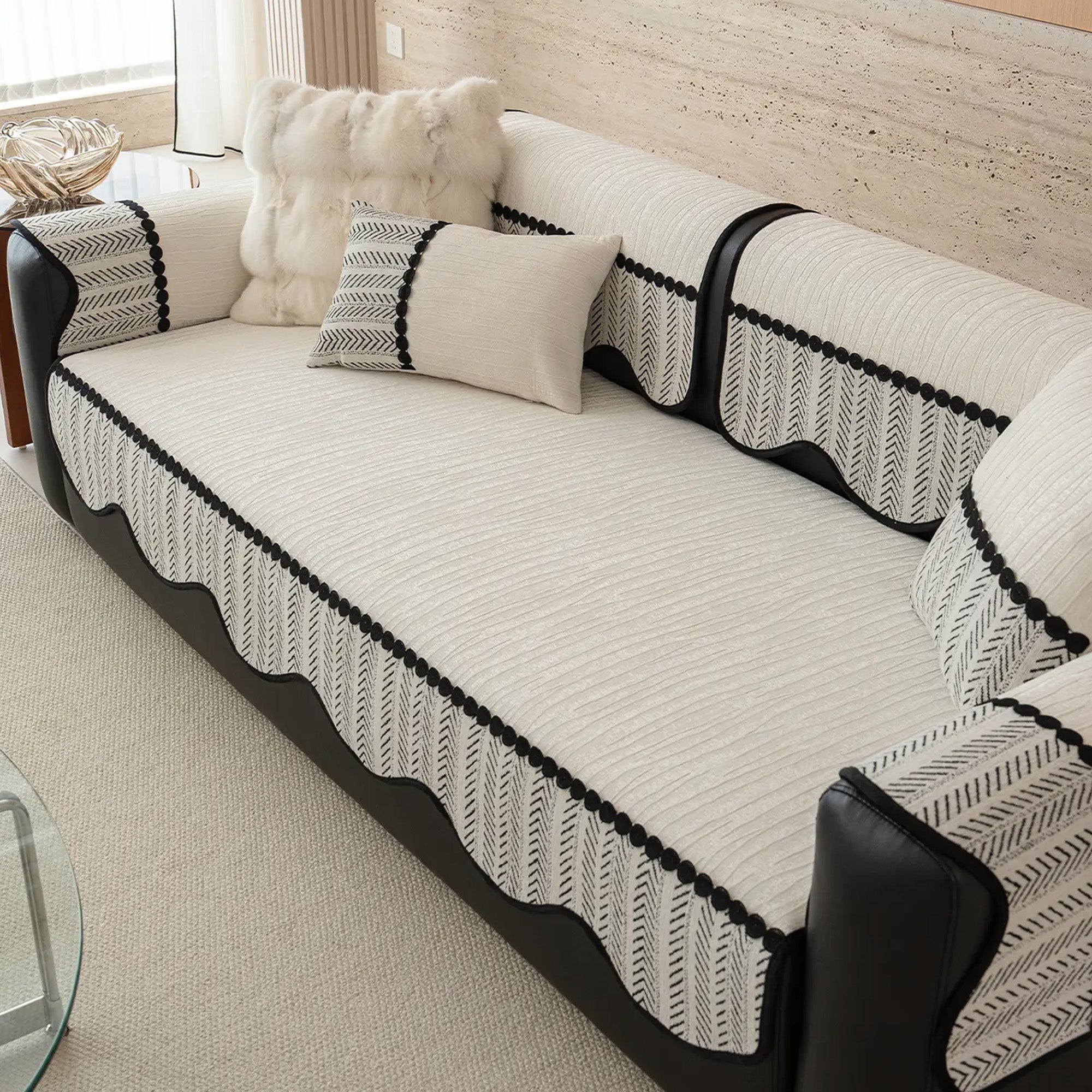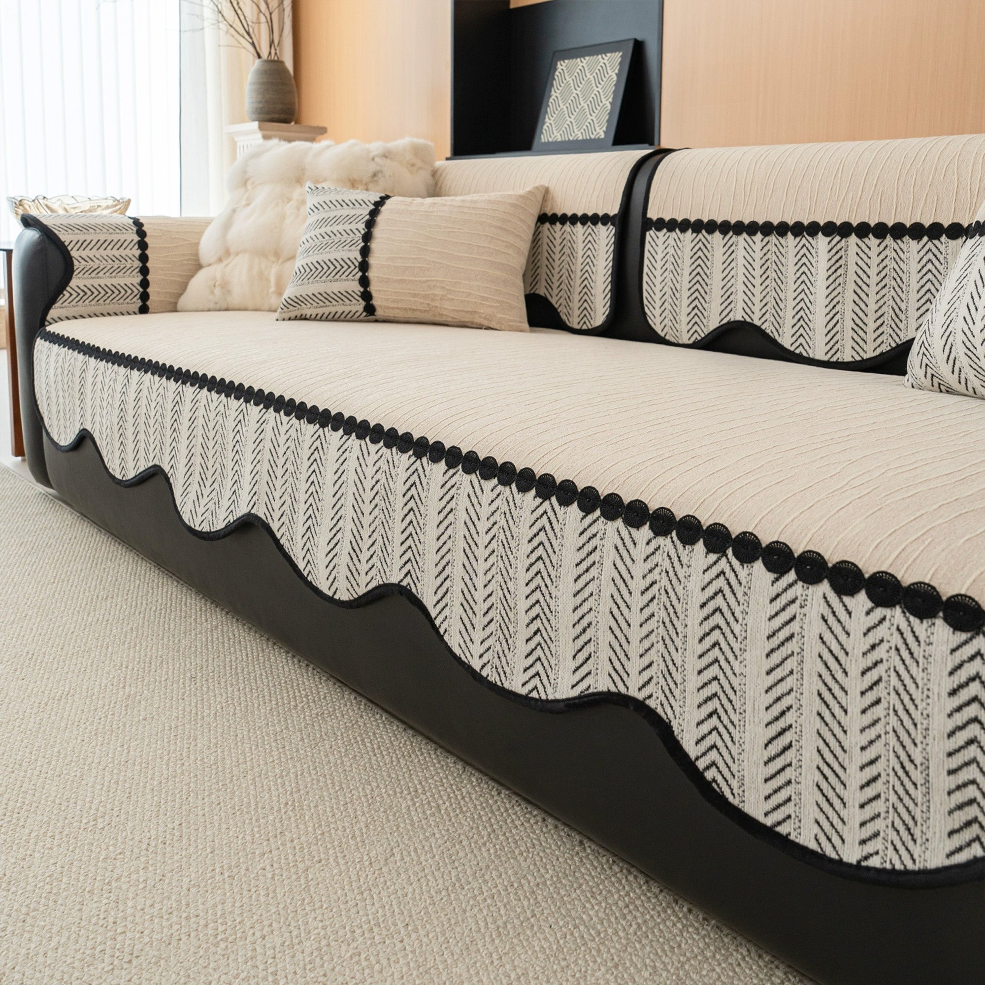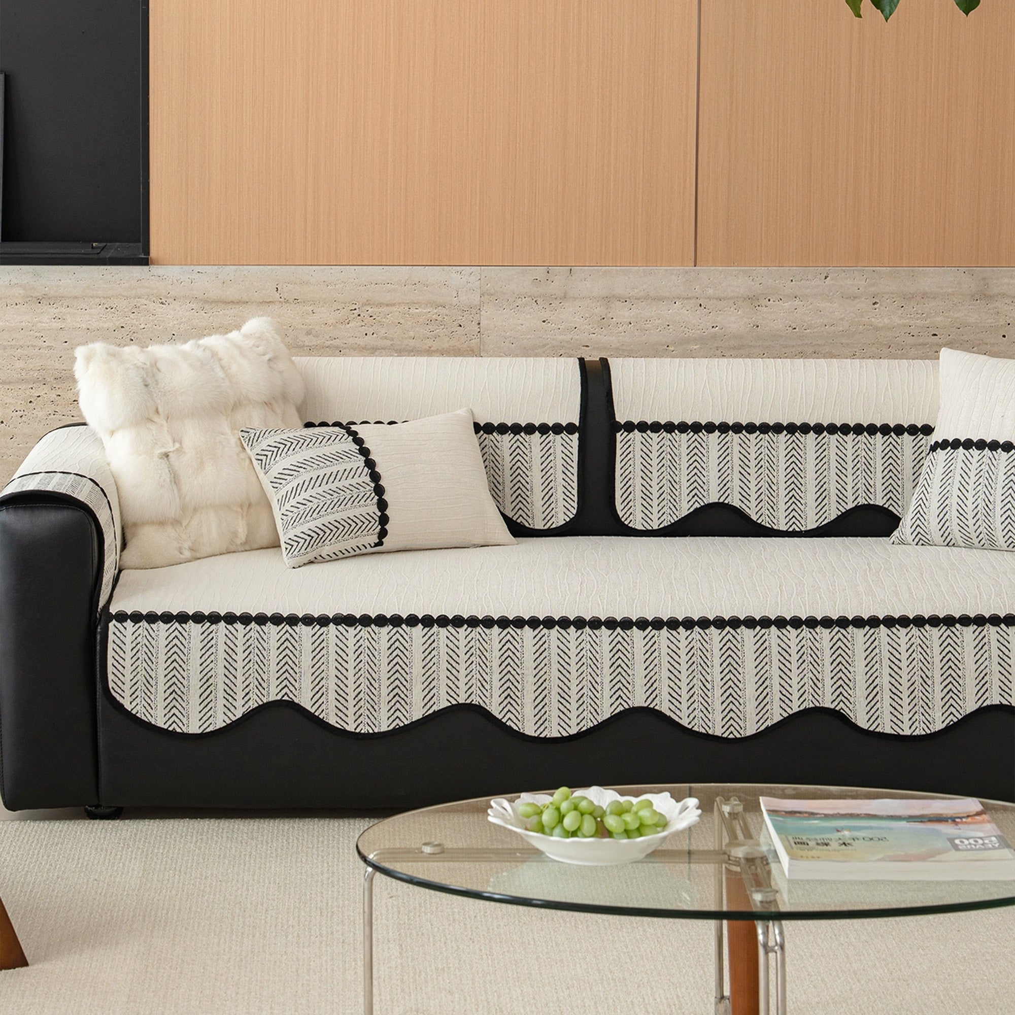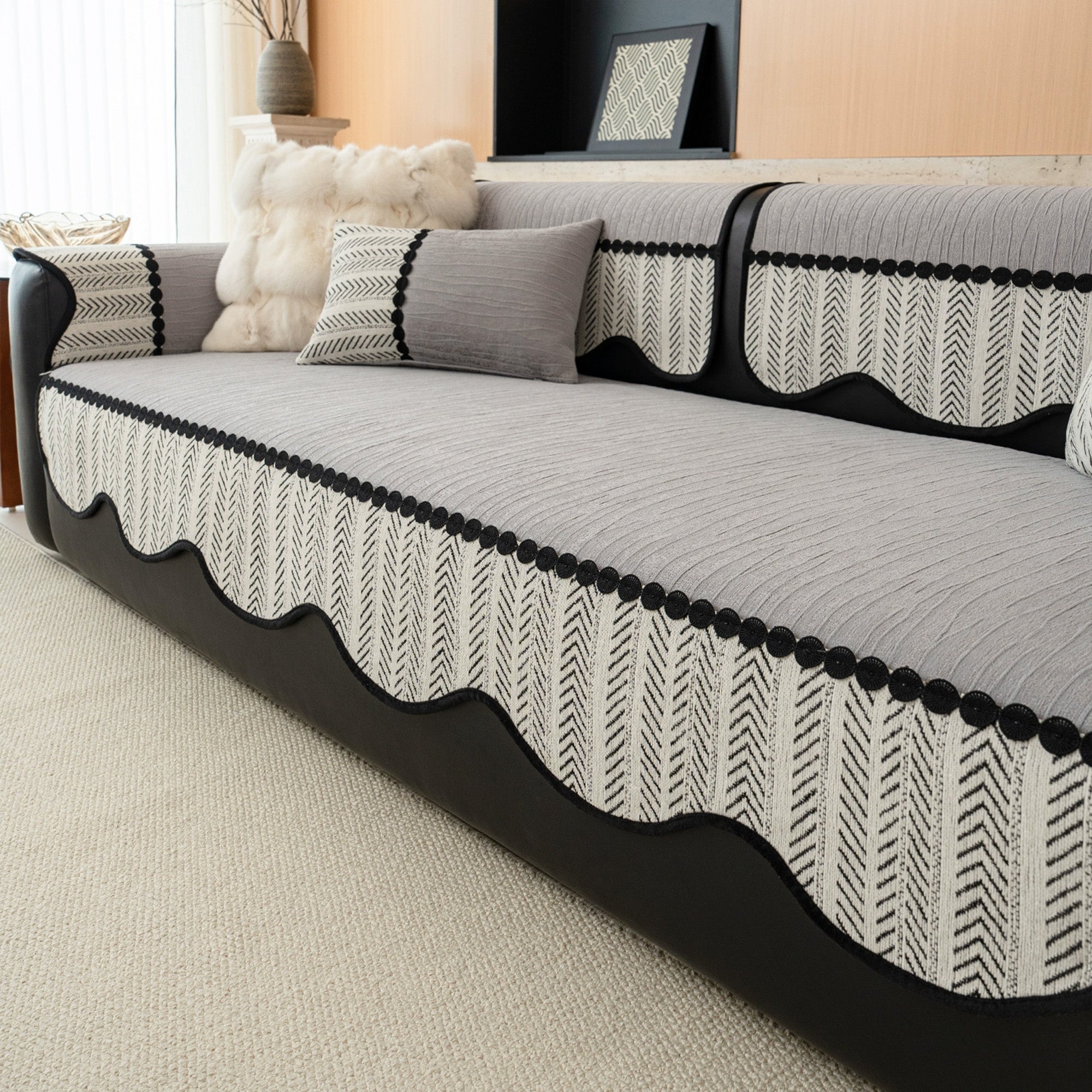 Eleve a decoração da sua casa com a Capa para Sofá Antiderrapante Geometric Charm Jacquard, com um design marcante inspirado em espinha de peixe, emoldurada por bordas pretas ousadas. Seu padrão artístico combina elegância atemporal com um toque moderno, criando um ponto focal elegante para qualquer sala de estar. Confeccionada em tecido jacquard premium, esta capa oferece durabilidade e conforto, além de oferecer uma funcionalidade antiderrapante confiável. Perfeita para proteger seu sofá contra o desgaste diário, pelos de animais de estimação ou derramamentos, ela combina perfeitamente com interiores contemporâneos e clássicos.
